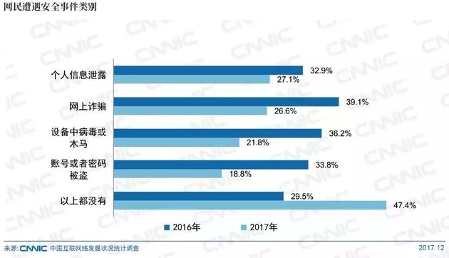 2017年我國網(wǎng)民在上網(wǎng)過程中遇到安全問題的比例明顯下降。數(shù)據(jù)顯示,高達47.4%的網(wǎng)民表示在過去半年中并未遇到過任何網(wǎng)絡(luò)安全問題,較2016年提升17.9個百分點。通過對用戶遭遇的網(wǎng)絡(luò)安全問題進行區(qū)分可以發(fā)現(xiàn),各類網(wǎng)絡(luò)安全事件發(fā)生的比例均較2016年明顯下降。其中,遭遇個人信息泄露問題占比最高,達到27.1%,但依然相比2016年下降5.7個百分點;遭遇賬號或密碼被盜的網(wǎng)民占比僅為18.8%,較2016年下降最多。