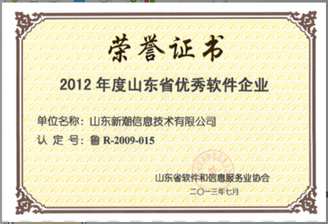熱烈祝賀我公司獲得由山東省軟件和信息服務(wù)業(yè)協(xié)會頒發(fā)的2012年度山東省優(yōu)秀軟件企業(yè)榮譽(yù)證書。